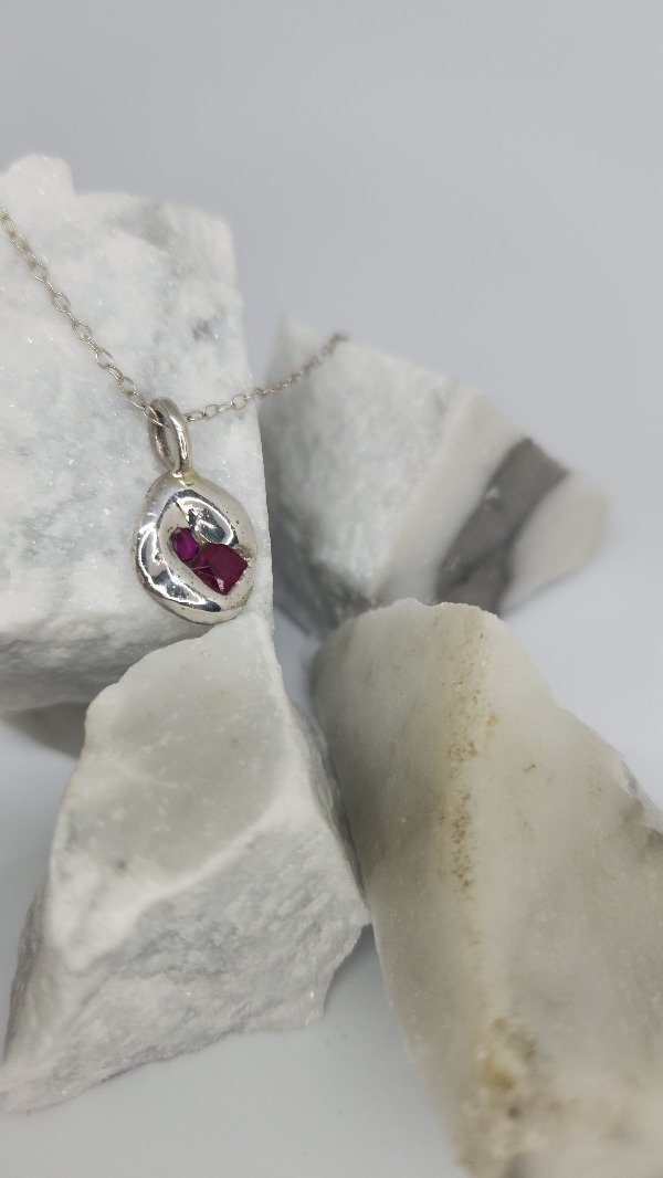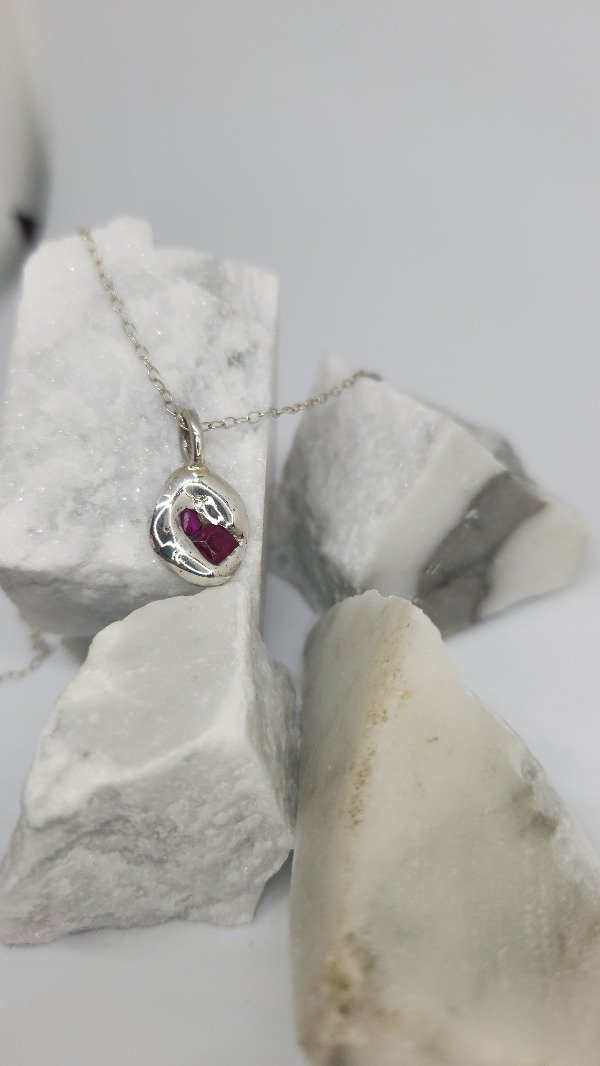 Colgante con rubíes reconstituidos , incrustados a fuego sobre el metal .